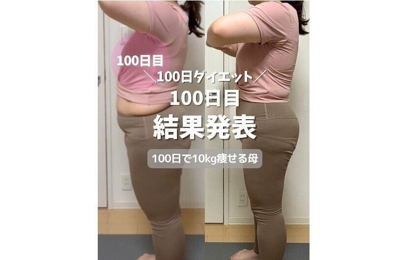 さらに、ダイエットを加速するため、4月からは、SNS上で「100日ダイエット」に挑戦しました。自宅でのトレーニングや、健康的な食生活をコツコツと続けた結果…こちらの写真が、100日間の体形の変化です。体重は、81.5kgから71.9kgと10kg近い減量に成功。二の腕、ウエスト、ヒップ、太もも、ふくらはぎとすべてサイズダウン!