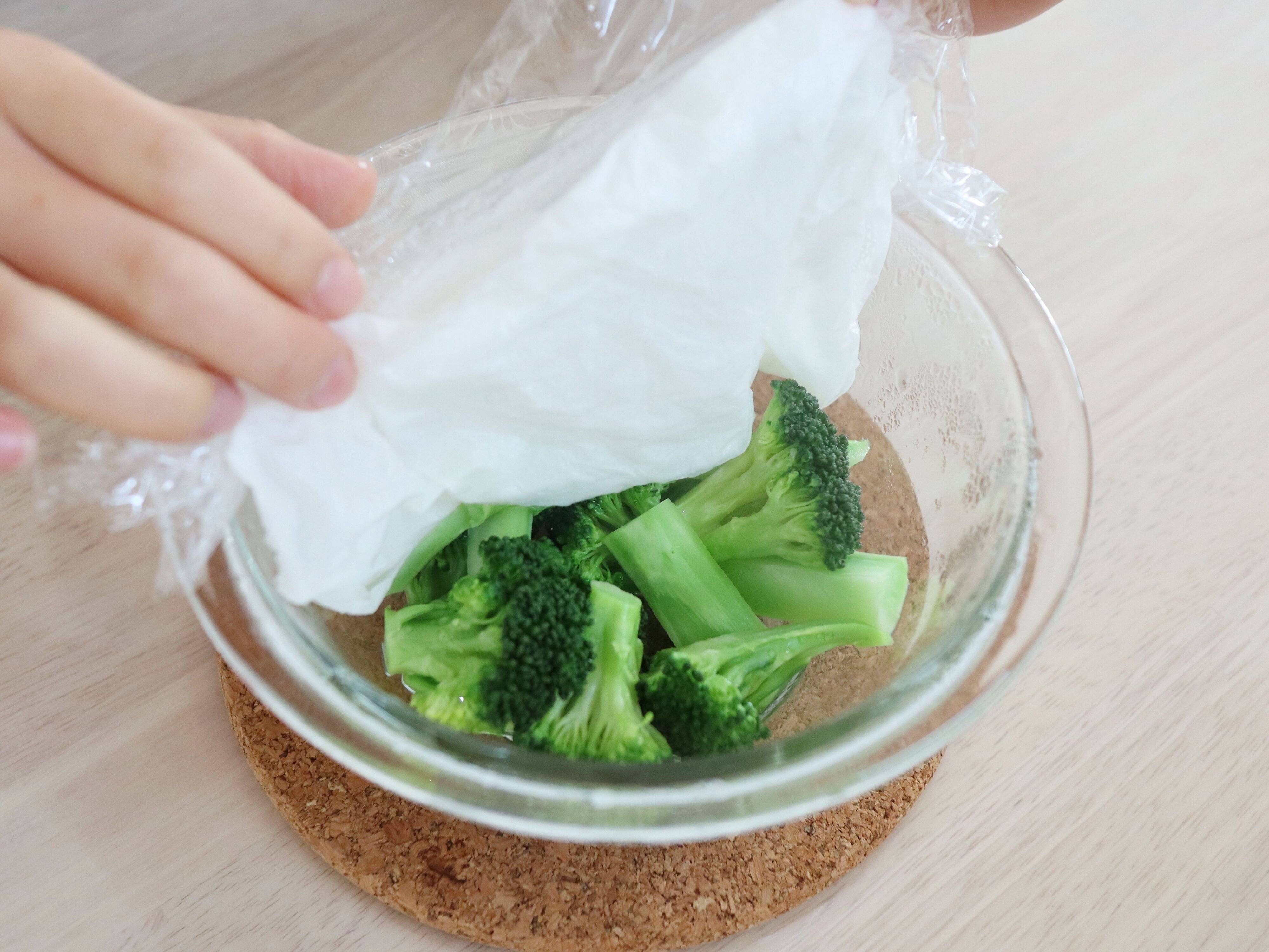 ひと工夫とは、ぬらしたキッチンペーパーを食材の上に被せて一緒に加熱するだけ。
