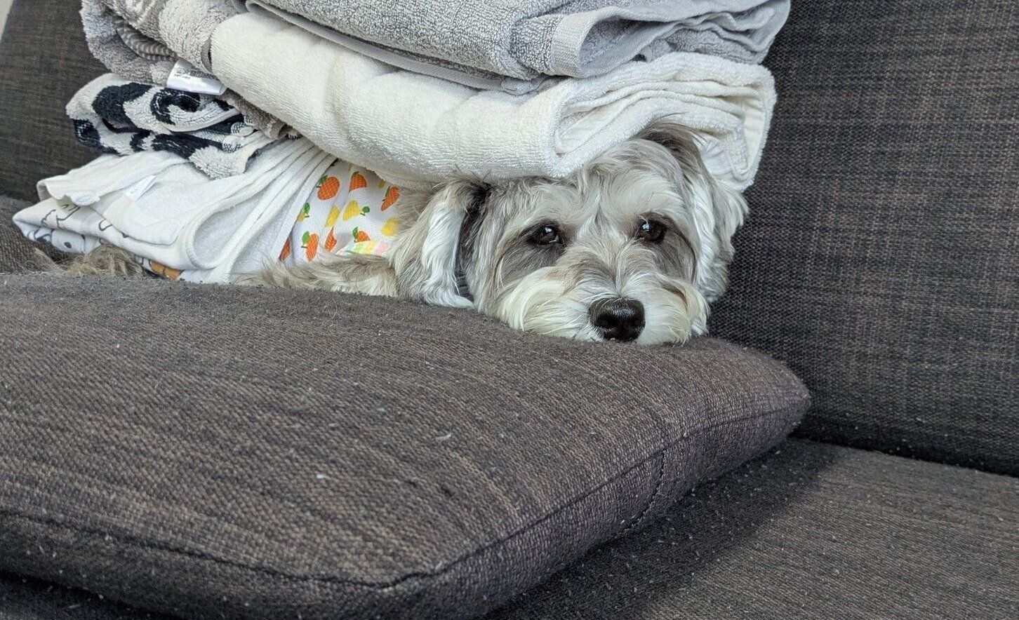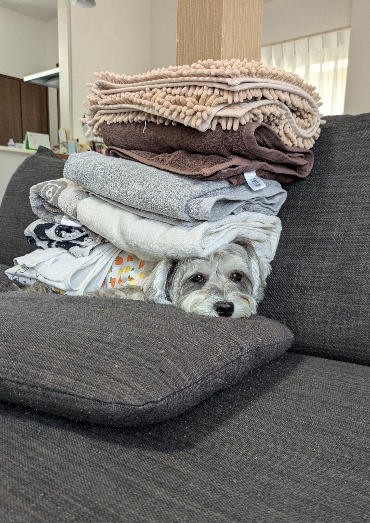 「ペレがソファで寝ていたので、その横で私がタオルを畳んでいました。重ねて置いていったら、ちょうどペレの上に積み上がる形になっていき、この状態になりました」